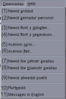 Mae'r opsiwn hwn yn rheoli ffont y sgrin a ddefnyddir yn ffenestr neges CySill. Cliciwch ar hwn ac yna dewiswch enw, maint ac edrychiad eich ffont. Dylech sicrhau bod digon o le i arddangos o leiaf dair llinell o destun yn ffenestr ddogfen CySill gyda'r ffont o'ch dewis.
