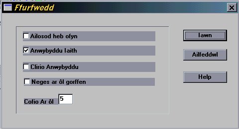 Cliciwch ar hwn i reoli'r ffordd y bydd acenion Cymraeg yn cael eu dangos yn ffenestr CySill. Mae gennych ddau ddewis yma, naill ai defnyddio llythrennau ag acenion diofyn Windows, defnyddio'r acenion a grëwyd gan MEU Cymru neu unrhyw lythrennau eraill.